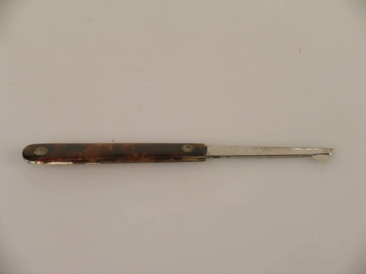 Lo strumento è a serramanico con impugnatura diritta. All'estremità di una barretta di acciaio è fissata, perpendicolarmente ad essa, una piccola punta, tagliente su entrambi i lati. Un piccolo prolungamento della barretta di acciaio, a forma di freccia, resta all'esterno dell'impugnatura quando lo strumento è chiuso e serve per estrarla più comodamente, esercitando su di esso una leggera pressione. Il manico è composto da due lamelle di tartaruga, tenute insieme da viti poste alle due estremità.