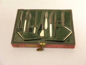 Scatola, priva del coperchio un tempo esistente, rivestita di pelle rossa con decorazioni dorate e foderata di velluto verde. In essa sono posizionati, in appositi alloggiamenti contornati da passamaneria dorata, undici strumenti per praticare la litotomia. Sul lato anteriore della scatola è posta la parte inferiore della serratura, in metallo dorato. E' presente la chiave, alla quale è applicata una targhetta, anch'essa in metallo dorato, che reca inciso il numero della scatola (XXIV) e la scritta 'Pro lithotomiae'. Sullo stesso lato è applicata anche un'etichetta di carta, recante la scritta 'Cistotomia'. Sul lato sinistro è presente un'altra etichetta di carta recante la scritta 'Cassetta N. XXIV Pro Lithotomia'.