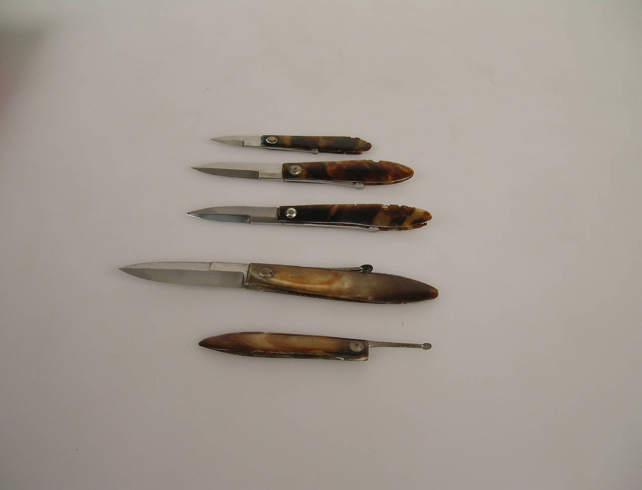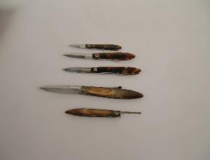 Strumenti a serramanico dotati di lama appuntita, tagliante su entrambi i lati e dotata di una nervatura centrale. La lama si prolunga in un peduncolo che fuoriesce dall'impugnatura in osso quando lo strumento è chiuso, ne facilita l'apertura e garantisce stabilità alla lama quando lo strumento è aperto.\nUna vite fissa l'impugnatura alla lama.