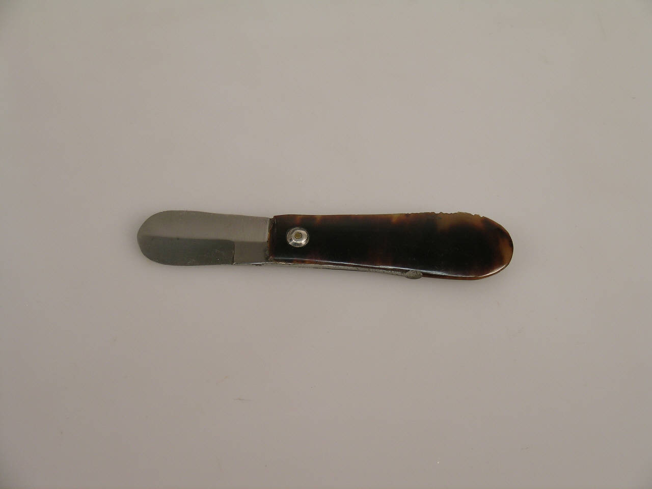 Strumento a serramanico dotato di lama con estremità arrotondata, tagliante su entrambi i lati e dotata di una nervatura centrale. La lama si prolunga in un peduncolo che fuoriesce dall'impugnatura in osso quando lo strumento è chiuso, ne facilita l'apertura e garantisce stabilità alla lama quando lo strumento è aperto.\nUna vite fissa l'impugnatura alla lama.