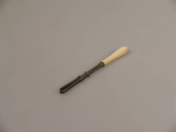 La pinzetta, dotata di un'impugnatura in avorio, ha i bracci che terminano a forma di spatola fenestrata. Grazie allo scorrimento di un anellino si può regolare l'apertura dei bracci.