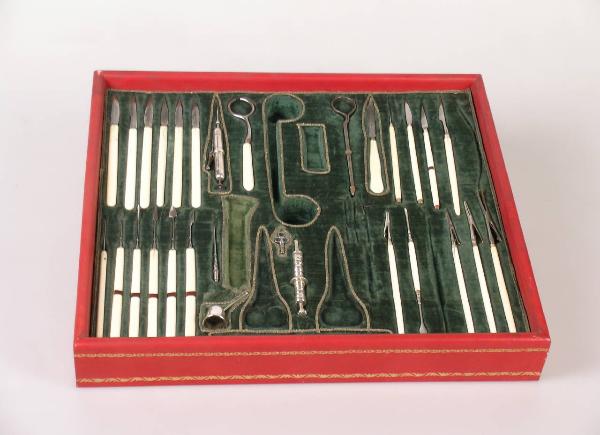 Scatola, rivestita di pelle rossa con decorazioni dorate lungo i bordi, e foderata di velluto verde. In essa sono posizionati, in appositi alloggiamenti (alcuni dei quali contornati da passamaneria dorata), quaranta strumenti - aghi, coltellini, uncini, forbicine (alcuni dei quali oggi mancanti) - utilizzati nell'operazione della cataratta.