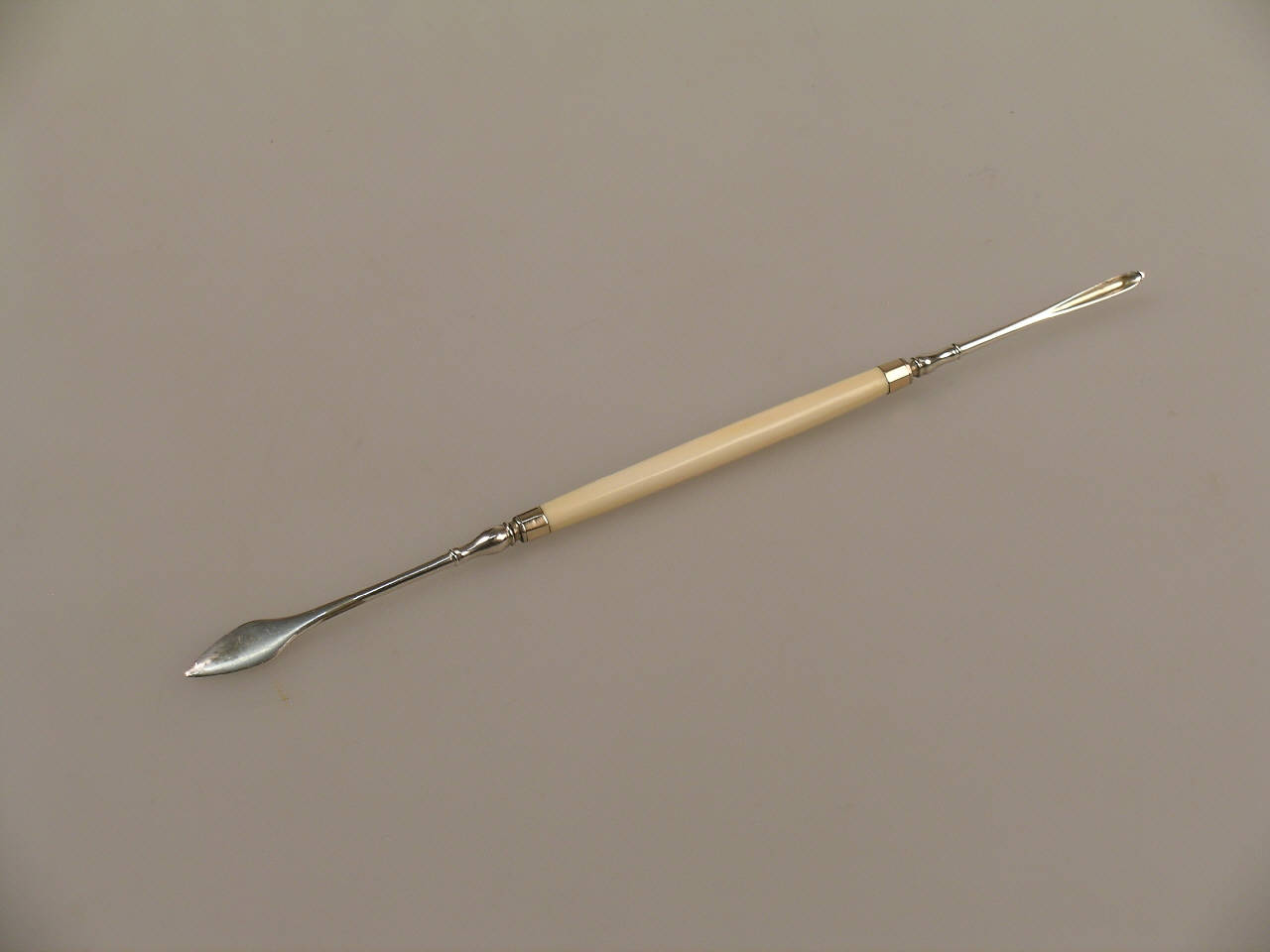 Lo strumento, dotato di un'impugnatura centrale d'avorio, presenta, da una estremità una spatolina romboidale e dall'altra un piccolo cucchiaio.