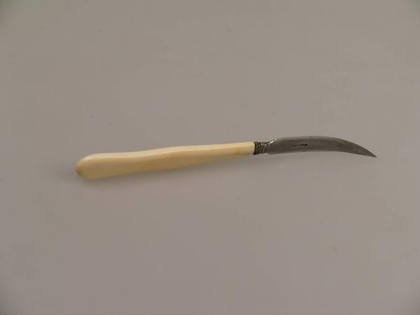 Su un manico di avorio leggermente sagomato è montata una lama appuntita, curva e tagliente su entrambi i lati.