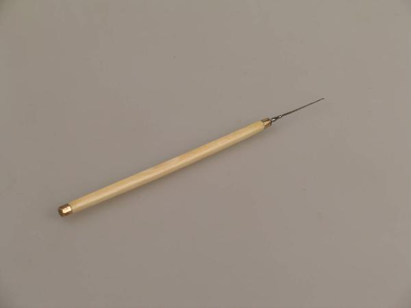 Su un'impugnatura di avorio è fissato un ago sottile e ricurvo all'estremità. Nel punto di innesto dell'ago è presente un anellino di metallo che ha probabilmente la funzione di irrobustire il manico in un punto in cui facilmente potrebbero crearsi venature. Simmetricamente si trova, all'estremità dello strumento, un anellino simile.
