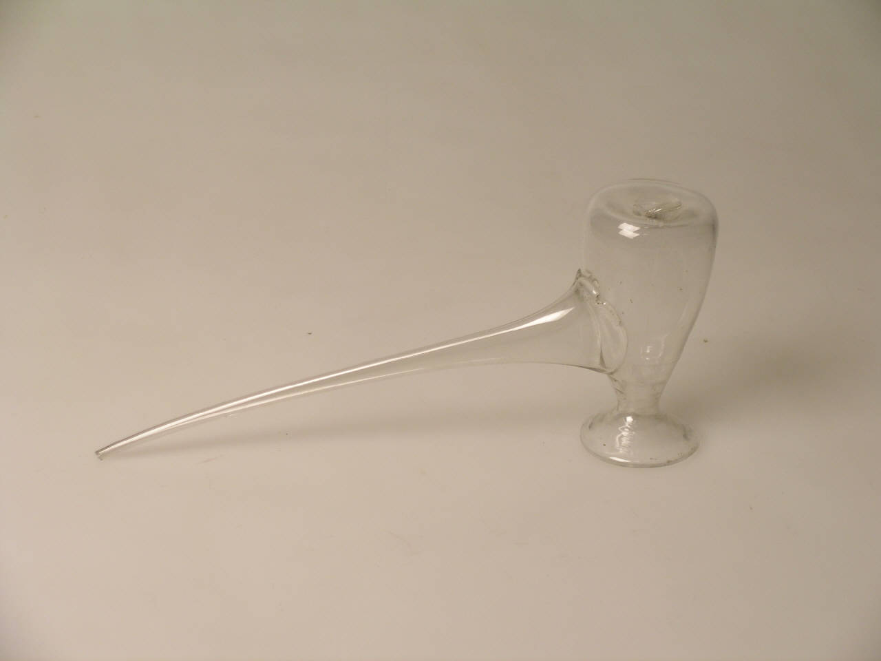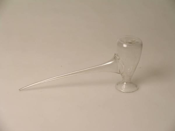 Contenitore di vetro dotato di una lunga cannula e di una imboccatura sagomata.