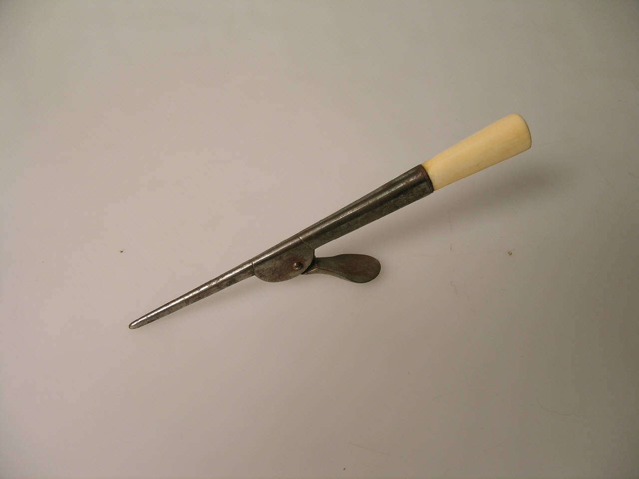 Su un'impugnatura d'avorio è montato un dispositivo nel quale una piccola lama diritta rimane nascosta all'interno di una custodia di acciaio e fuoriesce alla pressione di una leva fissata alla base della lama stessa . Una vite permette di fissare la lama all'interno dello strumento e la leva all'esterno, accanto all'impugnatura, in modo che si possa agire su di essa con il pollice quando si impugna lo strumento.
