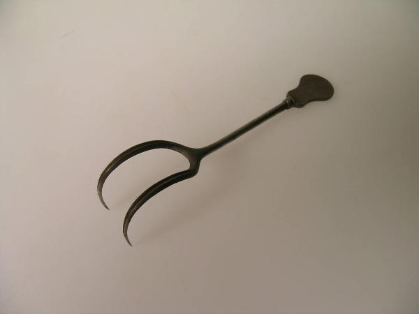Due aghi, molto ricurvi e solcati lungo la parte convessa si innestano in un manico che termina in una placchetta sagomata.