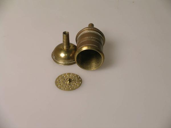 Piccolo recipiente di ottone dal corpo cilindrico con una base bucherellata e l'altra base costituita da un coperchietto anch'esso dotato di fori. Alle due estremità sono avvitate calotte semisferiche dotate, al centro, di un beccuccio.