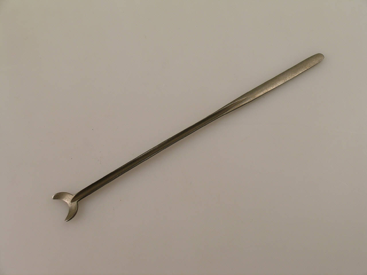 Lungo specillo dotato di una scanalatura praticata nel senso della lunghezza e di una estremità a forma di mezzaluna con le punte rivolte verso l'alto, tagliente nella parte concava.