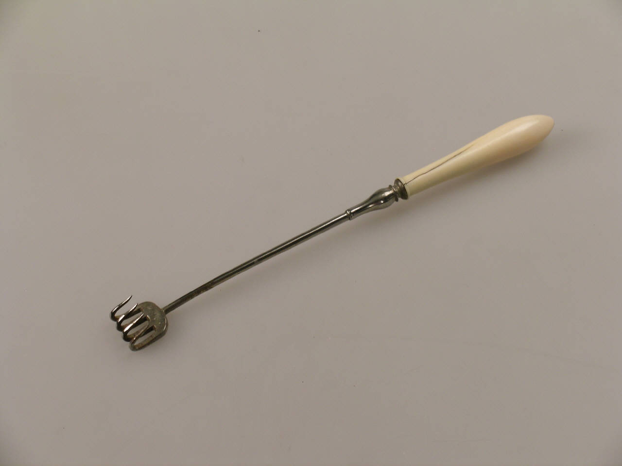 Su un manico in avorio a sezione circolare si innesta una barretta, anch'essa circolare, che porta quattro rebbi acuminati ad uncino.