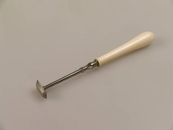 Su un manico in avorio si innesta una barretta tornita a sezione circolare che termina con una placchetta metallica a forma di tronco di piramide a base rettangolare, tagliente su tutti i lati della base.