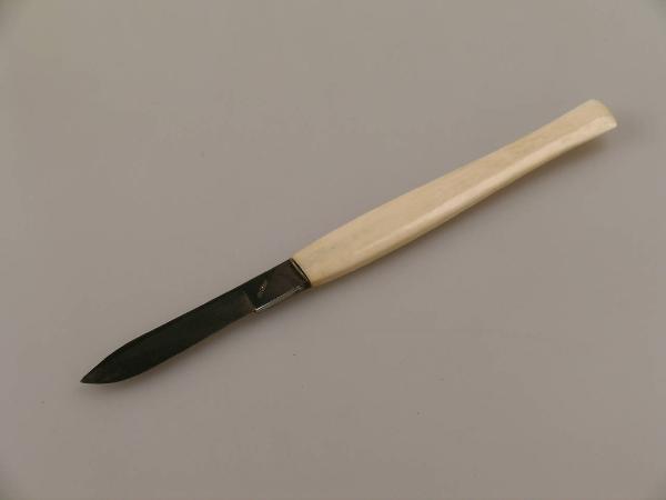 Coltello diritto e appuntito, con lama tagliente su uno dei lati e ispessita sul lato opposto, montata su una impugnatura in avorio.