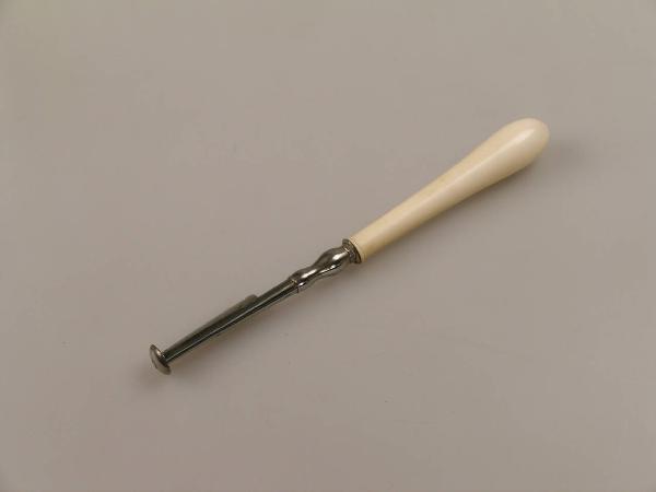 Strumento da taglio la cui lama presenta sulla punta una placchetta tonda e forgiata a guisa di lente, convessa verso l'esterno e concava dalla parte della lama stessa. Quest'ultima, tagliente su uno dei lati, costituisce il prolungamento di una barretta tornita a sezione circolare che si innesta in un manico in avorio.