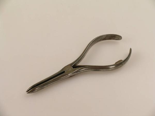 Pinza i cui bracci, uniti da una vite, curvi nell'impugnatura e diritti nelle punte, presentano una zigrinatura nella parte interna (per consentire una miglior presa). La pinza si apre premendo sull'impugnatura. La chiusura è garantita dalla presenza di una leva elastica fissata con una vite su uno dei bracci dell'impugnatura e incidente sull'altro.
