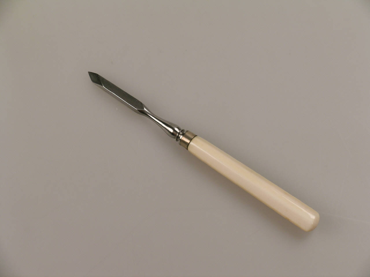 Su un manico in avorio a sezione ottagonale si innesta uno scalpello a forma di prisma, terminate con una punta acuta.