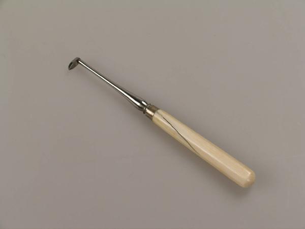 Su un manico in avorio a sezione ottagonale si innesta uno scalpello costituito da una barretta metallica a sezione circolare con una piccola punta posta perpendicolarmente.