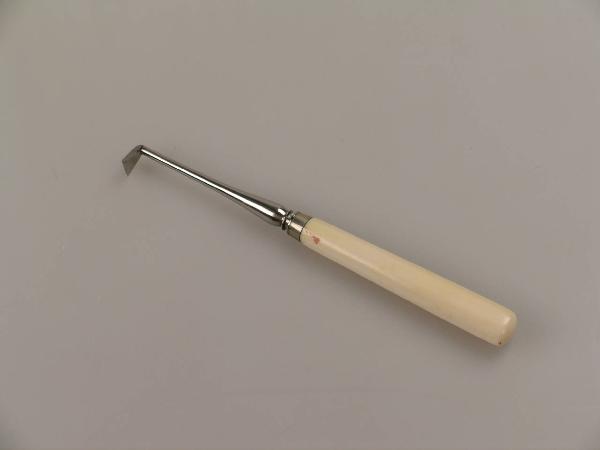 Su un manico in avorio si innesta uno scalpello costituito da una barretta metallica a sezione circolare che si piega a novanta gradi all'estremità formando una sorta di piccola zappa trapezoidale con gli angoli acuti.