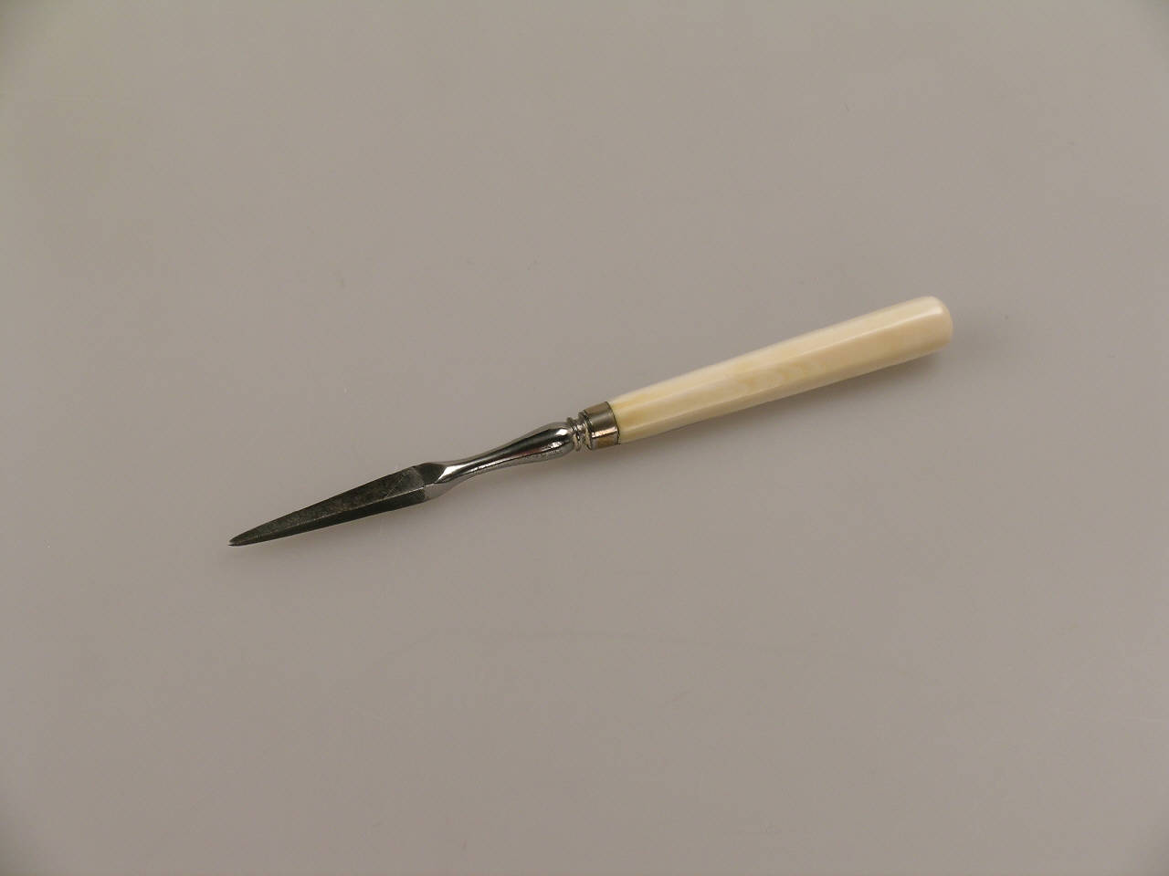 Su un manico in avorio si innesta uno stelo metallico tornito che si prolunga in una punta piramidale zigrinata.