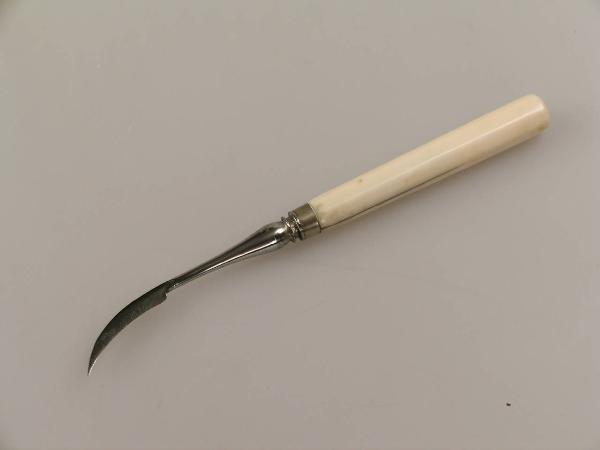Su un manico in avorio si innesta uno stelo di metallo, terminante in una lama ricurva e appuntita.