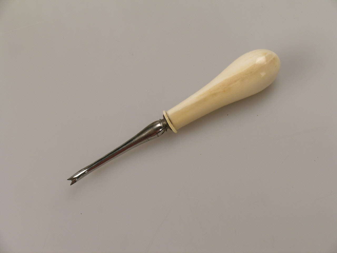 Su un manico in avorio a sezione circolare, più larga all'estremità dello strumento, si innesta una barretta di acciaio, anch'essa a sezione circolare che si incurva verso la punta formando un angolo ottuso e divaricandosi in due punte. Nella parte superiore è presente una zigrinatura.