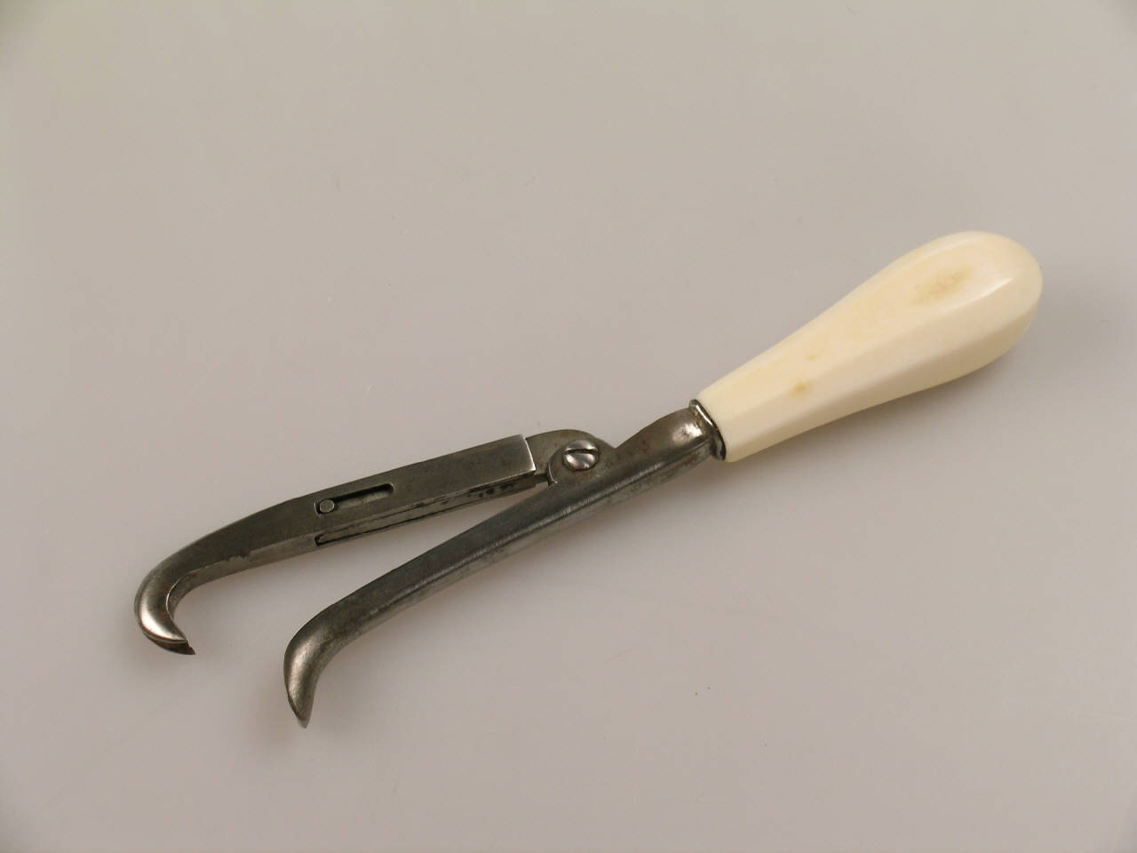 Su un manico in avorio a sezione ottagonale, si innesta una barretta di acciaio incurvata all'infuori alla sua estremità. Su di essa è fissata, tramite una vite, una seconda barretta, terminate con un gancio a doppia punta. La lunghezza di questa seconda barretta, dalla vite al gancio, è regolabile, in quanto essa risulta composta di due pezzi, che si incastrano l'uno nell'altro in diverse posizioni grazie alla presenza di quattro denti nel primo pezzo e di due finestre nel secondo. In base alla lunghezza di questa parte la pinza può avere diversi gradi di apertura.