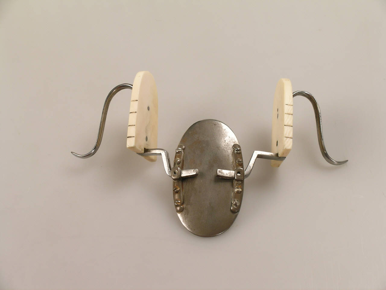 A una placchetta metallica ovale sono fissate, su entrambi i lati, tramite due sottili strisce metalliche fermate da alcune viti, due barrette piegate due volte ad angolo ottuso, sulle quali si innestano due pezzetti di avorio, la cui forma è circa la metà di un ovale. Le barrette, poi, proseguono ancora, incurvandosi e sporgendo all'infuori rispetto alla parte in avorio, formando due alette che dovevano abbracciare labbra e gote.