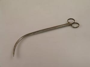 Pinza costituita da due bracci, terminanti ad anello nell'estremità che costituisce l'impugnatura e incurvati all'altra estremità. Nel braccio superiore, o più esterno, si trovano due scanalature oblunghe nella quali si inseriscono e possono scorrere due piccole protuberanze del braccio inferiore, o interno. Queste, fissate tramite una piccola vite, tengono uniti i due bracci della pinza, in modo però che possano scorrere l'uno sull'altro, consentendo l'apertura della pinza stessa, che avviene appunto muovendo verso l'alto il braccio esterno. Le punte della pinza presentano una zigrinatura nella parte interna per consentire una migliore presa.