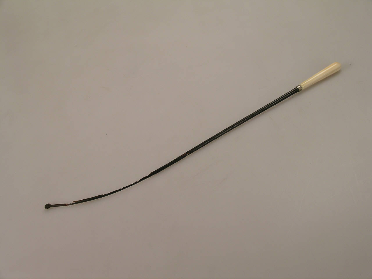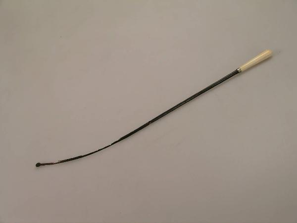 Stecca di balana ricurva inserita su un manico in avorio a sezione ottagonale, tramite un anellino di ottone, All'estremità la stecca si allarga in un bottoncino dotato di due fori.