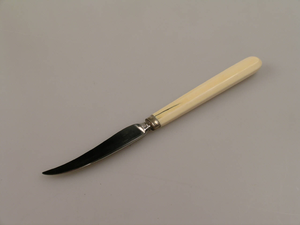 Coltello falcato, con impugnatura di avorio a sezione ottagonale. La lama è ispessita dalla parte opposta al tagliente (posto nella parte concava).