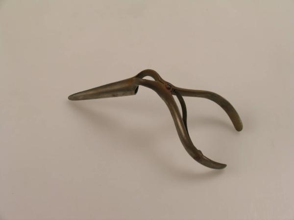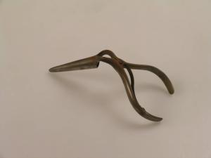 Strumento bivalve, curvo, i cui bracci presentano, quando sono accostati, una forma a semicono e terminano ad ansa nell'impugnatura. Lo strumento si apre esercitando una pressione sull'impugnatura, all'interno della quale è fissata una piccola leva (fissata cib una vite ad uno deui bracci e incidente sull'altro) che consente la chiusura dello strumento al venir meno della pressione.