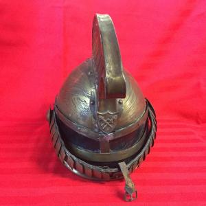 Elmo in cuoio verniciato e ottone da parata. Soggolo con scaglie e borchie in ottone.stemma in ottone con scudo all'interno del quale compaiono la torcia, l'ascia, la squadra. Sembra mancare il fregio più importante, di appartenenza