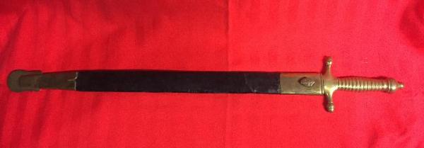 Spada in ferro, ottone e custodia in cuoio.Elsa in ottone, lama in ferro, custodia in cuoio con bordo e puntale in ottone. Stemma con scudo crociato sulla custodia. La lama misura cm.3.5 di larghezza, l'elsa cm.9