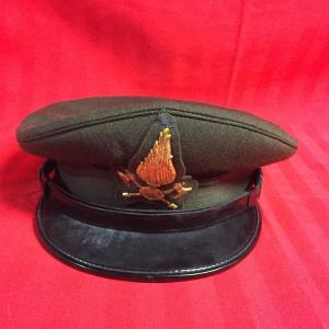Berretto in sallia da caporeparto, con stemma ricamato in oro, visiera e soggolo in cuoio nero lucido, tre rombi in ottone dorato sul bordo del soggolo,fascia interna in cuoio, fodera in raso con marchio di fabbrica "S.Cardia" Roma, misura 56