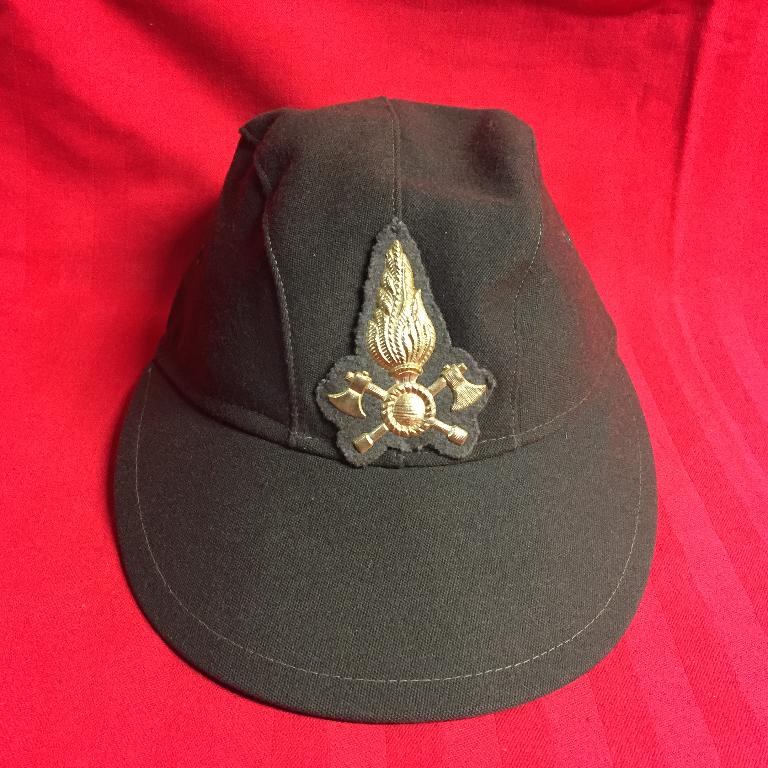 Berretto in panno con visiera in panno rigida, divisa invernale da "fatica", stemma ricamato in oro, fascia interna in grosgrain, fodera in stoffa, fori di aerazione, Ditta Mirage S.r.l. Milano