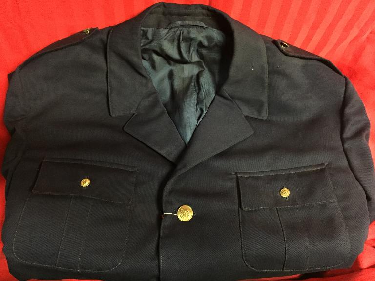 Giacca da divisa in tela blu, divisa invernale, quattro tasche, taglia 58, bottoni dorati con stemma con stellina entro scudo e asce incrociate (come bottoni giacca scheda n.179).Divisa nuova con etichetta ancora attaccata ai bottoni