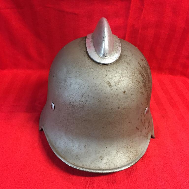 Elmo da incendio mod. tedesco in ferro nichelato, con cresta in alluminio avvitata, con stemmi tedeschi periodo bellico, fori aerazione, marocchino in cuoio, imbottitura in cuoio, sottogola in cuoio