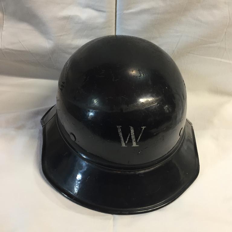 Elmo in ferro verniciato di nero, tipo M38 Gladiator, in uso alla Luftshutz, con visiera e paranuca applicati, fori aerazione, marocchino in cuoio, sottogola in cuoio, una lettera "W" verniciata sul davanti. All'interno una scritta in tedesco identica ad altri esemplari presenti nei musei o sul mercato (vedi fonti e documenti)ed una sigla incisa "RL2-38/31" (nei documenti)