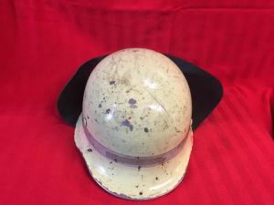 Elmo mod. tedesco del corpo dei Vigili del Fuoco di Ravensburg, in alluminio dipinto di vernice fotoluminescente giallina, con fascia argento catarifrangente, fori aerazione, copricollo in cuoio, marocchino in cuoio con lacci, imbottitura in cuoio, sottogola in cuoio, n.2 esemplari. Assieme ai caschi vi sono una tuta completa (scheda n.192) ed un distintivo ricamato (nei documenti)