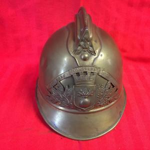 Elmo in ottone con stemma "Sapeurs Pompiers d'Heidwiller" (comune francese dell'alto Reno, Grand Est), cresta avvitata, visiera e paranuca in un unico pezzo applicato, marocchino in cuoio con lacci, sottogola in cuoio