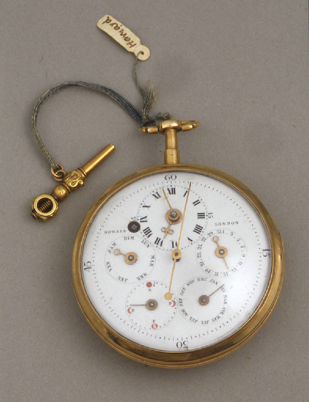 Cassa in oro costruita in due parti: fondello e lunetta portavetro. Pendente a disco con collo cilindrico e anello ovale fissato con vite.\nQuadrante in smalto bianco con indicazione dei secondi al centro in cifre arabe di quindici in quindici. Quadrantino alle ore 12 per l'indicazione delle ore, in caratteri romani, e i minuti, ai quarti, in cifre arabe. Quadrantino a ore 3 per l'indicazione dei giorni del mese. Quadrantino a ore 5 per l'indicazione del mese. Quadrantino a ore 7 per l'indicazione delle fasi lunari. Quadrantino a ore 9 per l'indicazione del giorno della settimana. Lancette per il tempo in oro a forma di fiore. Lancetta per i secondi in ottone dorato filiformi.\nMovimento a platina intera con colonnini cilindrici. Conoide a catena. Scappamento a verga. Ponte bilanciere traforato e inciso a due piedi con controperno in acciaio. Regolazione del tempo a chiavetta su quadrantino. Carica e messa all'ora a chiavetta.