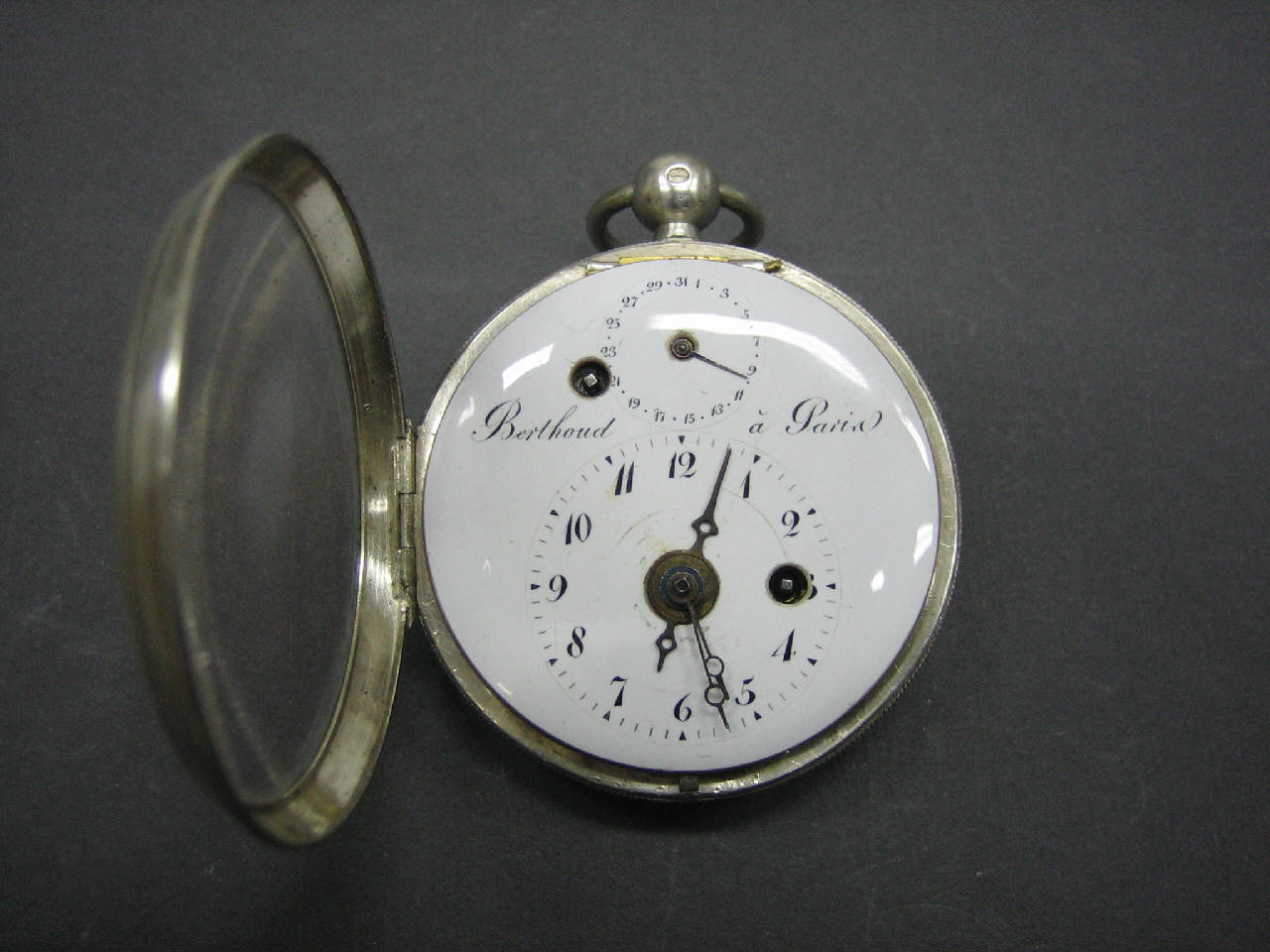 Cassa costruita in quattro parti: carrure godronata, cuvette, con supporto per il posizionamento della campanella, incisa con motivi floreali e traforata per la diffusione del suono, fondello e lunetta portavetro. Pendente sferico con anello circolare inserito a pressione.\nQuadrante con quadrantino delle ore in basso, indicazione delle ore in cifre arabe. In alto quadrantino con indicazione del giorno del mese. Apertura a ore 3 per la carica del tempo e apertura a ore 11 per la carica della sveglia. Lancette delle ore e indicazione della sveglia in stile Breguet, lancetta del datario filiforme.\nMovimento a platina intera con colonnini cilindrici. Conoide a catena. Scappamento a verga. Ponte bilanciere traforato e inciso a due piedi con controperno in acciaio. Regolazione del tempo a racchetta su quadrantino. Sistema di carica e di messa all'ora a chiavetta.