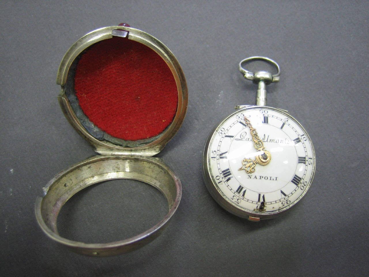 Doppia cassa con controcassa liscia. Cassa liscia con foro di carica. Pendente a disco con collo cilindrico e anello circolare spinato.\nQuadrante con indicazione delle ore in numeri romani, indicazione dei minuti in cifre arabe di cinque in cinque. Lancette incise e traforate.\nMovimento a platina intera con colonnini a balaustro. Conoide a catena. Scappamento a verga. Ponte bilanciere a un piede con contropiede in rubino con mascherone. Regolazione del tempo a chiavetta su quadrantino. Carica a chiavetta da tergo.