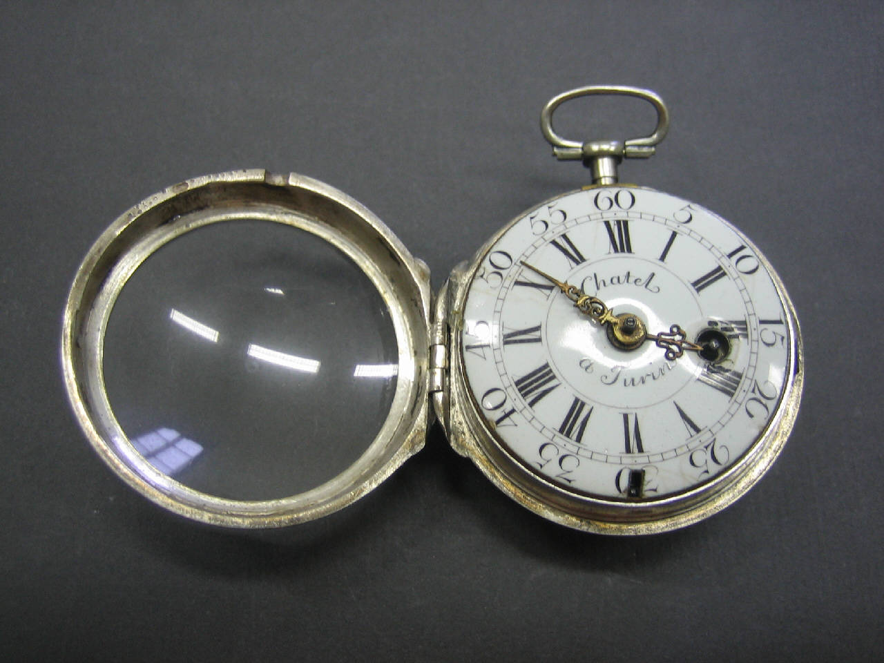 Cassa in due parti: fondo liscio e lunetta portavetro. Pendente a disco con supporto cilindrico e anello ovale.\nQuadrante con indicazione delle ore in numeri romani e indicazione dei minuti in cifre arabe di cinque in cinque. Lancette traforate e incise.\nMovimento a platina intera con colonnini a balaustro. Conoide a catena. Scappamento a verga. Ponte bilanciere traforato e inciso a due piedi con controperno in acciaio. Regolazione del tempo a chiavetta su quadrantino. Carica a chiavetta anteriore.
