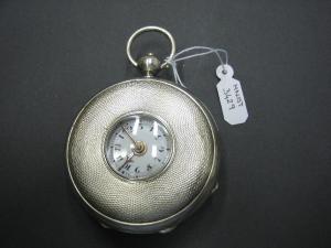 Cassa in tre parti: fondo con decorazione a guillochet, cuvette liscia con un foro di carica e lunetta semichiusa con vetro per la lettura delle ore. Pendente sferico con pulsante per l'apertura della cassa e anello circolare fissato con vite.\nQuadrante in smalto bianco con indicazione delle ore e dei minuti sia sul bordo che al centro per permetterne la lettura anche dall'apertura nella lunetta. Indicazione delle ore in cifre arabe. Lancette a doppia freccia in corrispondenza del quadrantino centrale.\nMovimento a platina intera con colonnini cilindrici. Ponte bilanciere traforato e inciso a un piede con controperno in acciaio.Conoide con catena. Scappamento a cilindro. Regolazione del tempo a racchetta su settore graduato Slow/Fast. Carica a chiavetta posteriore. Copripolvere amovibile.