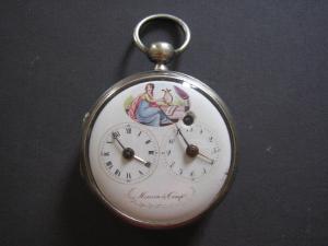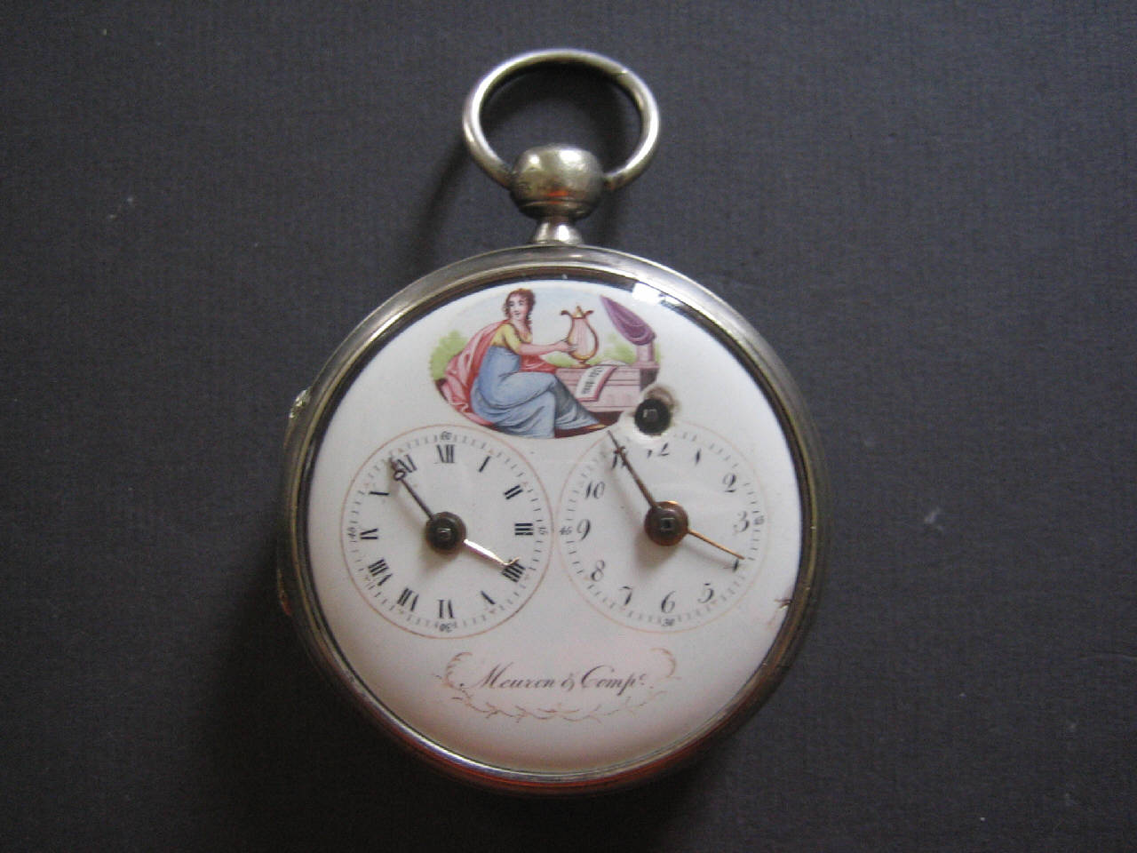 Cassa in tre parti: fondo liscio, carrure godronata, lunetta portavetro. Pendente sferico con collo a cono e anello circolare inserito a pressione.\nMostra in smalto con decorazione e doppio quadrante per l'indicazione dell'ora all'italiana e alla francese. Quadrante a destra con indicazione delle ore in cifre arabe e indicazione dei minuti di quindici in quindici in cifre arabe. Lancetta filiforme delle ore e a croce dei minuti. Quadrante a sinistra con indicazione delle ore in caratteri romani e indicazione dei minuti di quindici in quindici in cifre arabe. Lancetta filiforme delle ore e traforata dei minuti. Foro di carica.\nMovimento a platina intera con colonnini cilindrici. Conoide a catena. Scappamento a verga. Ponte bilanciere a due piedi traforato e inciso, con controperno in acciaio. Regolazione del tempo a chiavetta su quadrantino. Carica anteriore a chiavetta. Cassa non originale.