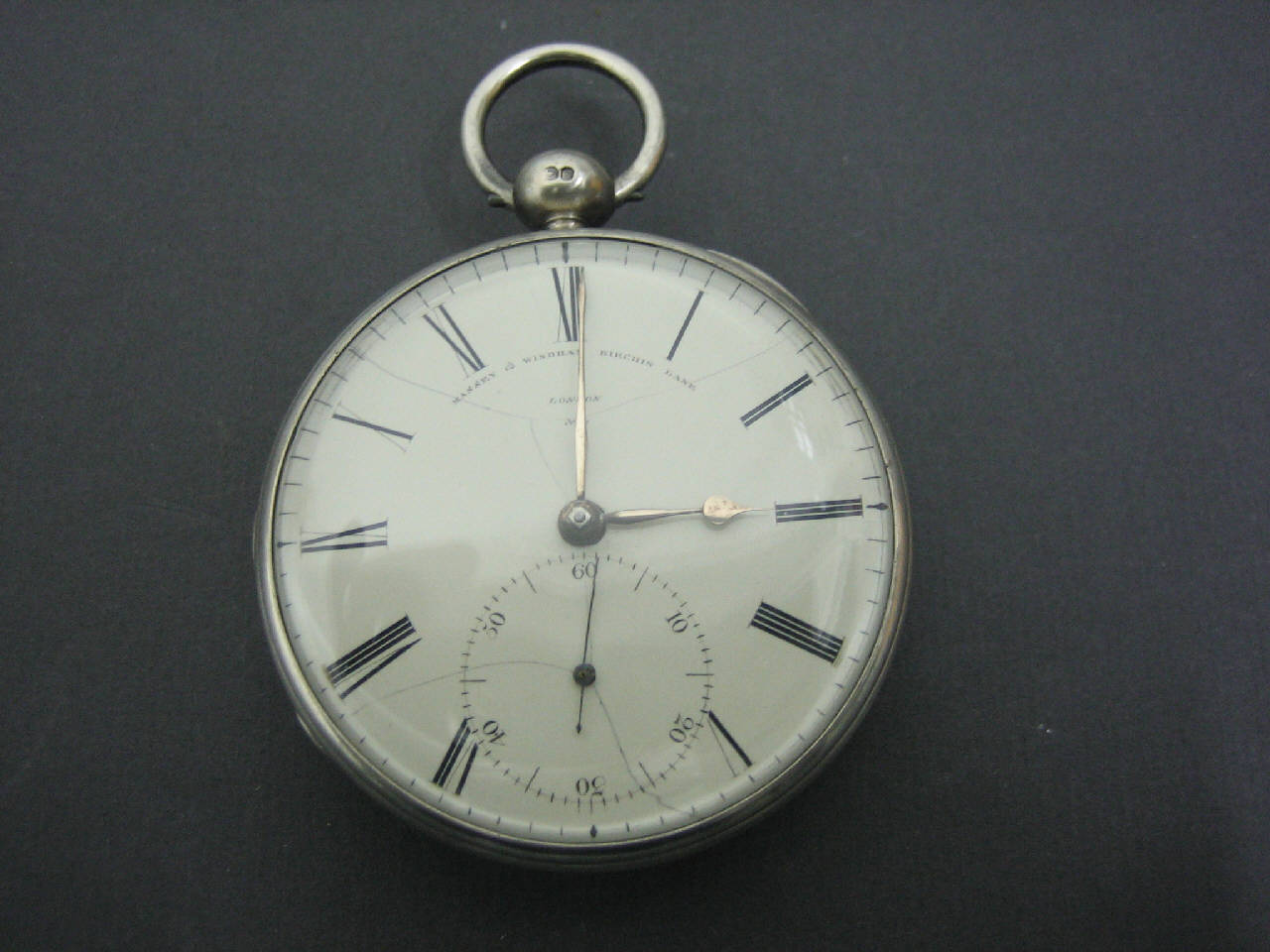 Cassa in tre parti: fondo con decorazione a guillochet, cuvette liscia con foro di carica e lunetta portavetro. Pendente sferico con anello circolare fissato con vite.\nQuadrante in smalto bianco con indicazione delle ore in caratteri romani. Quadrantino dei secondi nella partre bassa con indicazione di dieci in dieci in cifre arabe.\nMovimento a platina intera con colonnini cilindrici. Conoide di regolazione. Scappamento ad ancora con ruota scappamento a denti verticali a colonna. Ponte bilanciere a un piede con controperno in diamante. Regolazione del tempo su settore graduato Slow/Fast. Carica posteriore a chiavetta.