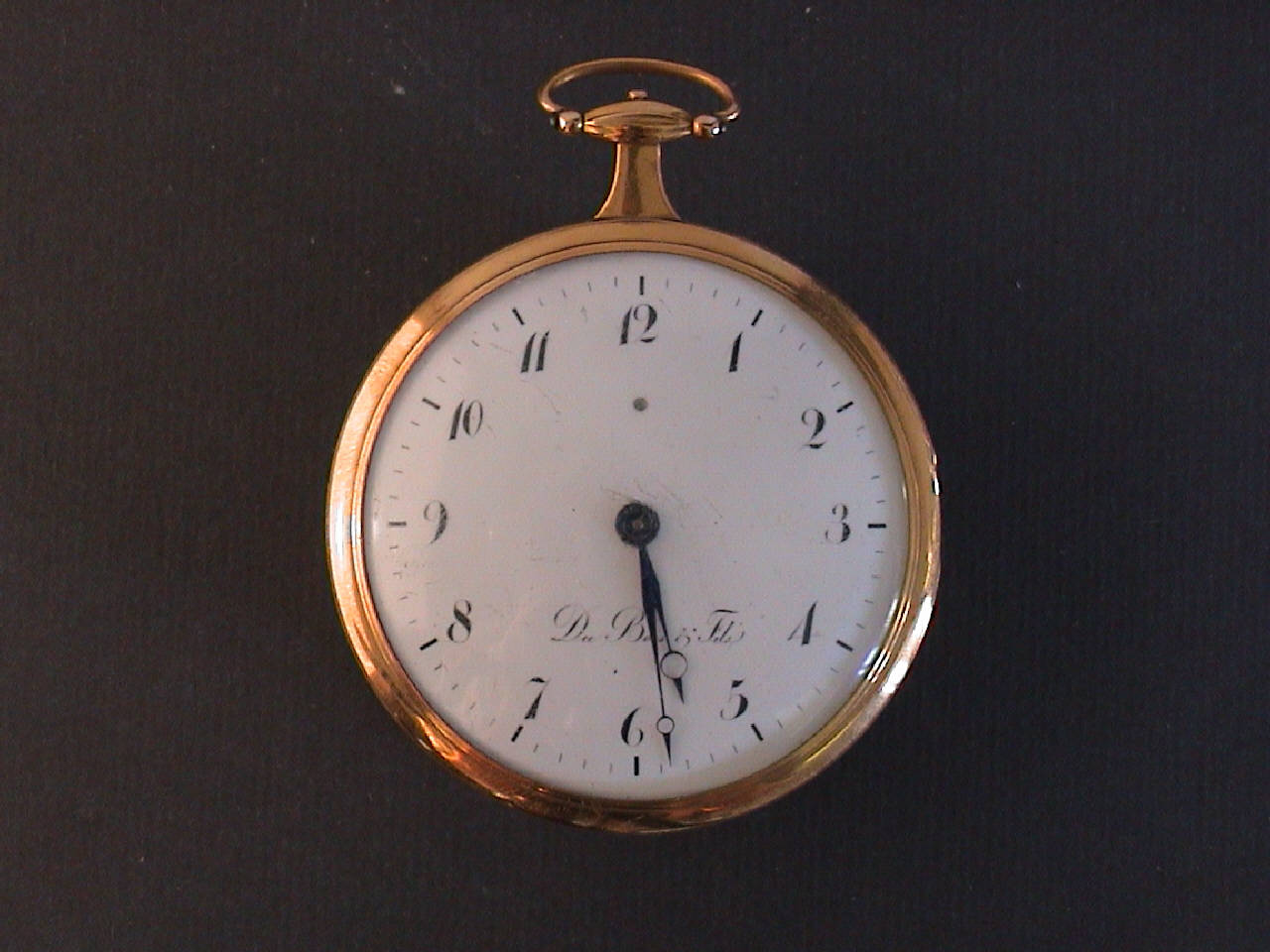 Cassa in in quattro parti: fondo inciso con raggi che partono da un ovale nella parte bassa, cuvette liscia con un foro di carica, carrure liscia e lunetta portavetro. Pendente a oliva con collo svasato e anello ovale spinato.\nQuadrante in smalto bianco con indicazione delle ore in cifre arabe. Lancette Breguet.\nMovimento a platina intera. Scappamento a cilindro. Ponte bilanciere a due piedi a forma di baffi e controperno in diamante. Regolazione del tempo a racchetta su settore graduato Avance/Retard. Carica a chiavetta posteriore.