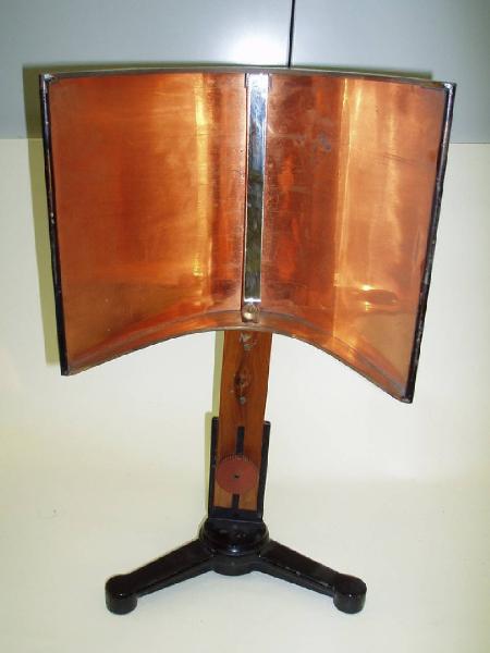 Un sostegno in legno regolabile in altezza, fissato su di un tripiede in metallo, ospita un riflettore parabolico in rame. Nel fuoco della parabola è fissato il rivelatore del tipo a specchio con argentatura intagliata (manca intaglio). La parabola e il rivelatore ad esso solidale sono liberi di ruotare intorno al perno di accopiamento con il sostegno in legno. Dietro al sostegno in legno e solidale con esso è presente una scala circolare graduta (da 0° a 90°) in ottone. Una lancetta in ottone calettata sull'albero di rotazione della parabola indica l'iclinazione della parabola e del rivelatore. \nIl vetro argentato è stato aggiunto in un secondo momento e manca del fondamentale intaglio nell'argentatura.