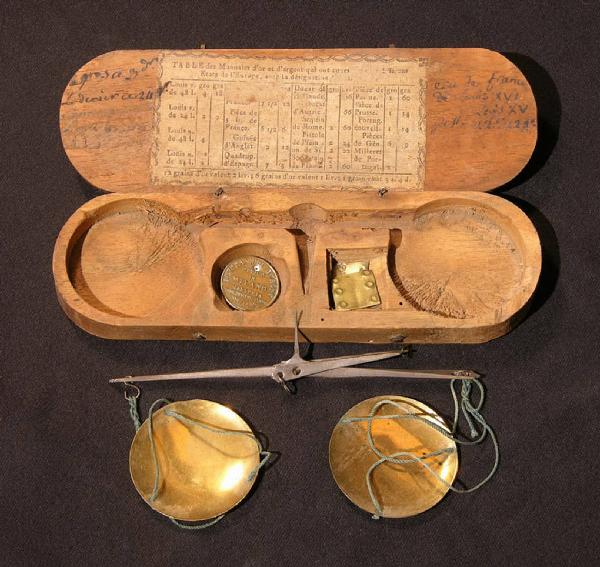 L'oggetto è conservato dentro a un astuccio in legno di forma rettangolare ma dalle estremità arrotondate. L'interno è stato scavato per ricavare l'alloggio per una piccola bilancina pesa monete e metalli preziosi e per alcuni pesi campione. Lo strumento vero e proprio si compone di due piccoli piatti collegati alle estremità opposte dell'asta del bilanciere per mezzo di tre punti di sospensione e un filo di cotone o seta. Esattamente al centro del braccio della bilancia è incernierata un'asticella che costituisce il punto di sospensione; un indice consente di visualizzare con facilità e immediatezza il punto di equilibrio.\nSulla parte interna del coperchio è incollata una tabellina che riassume le unità di misura in uso all'epoca.